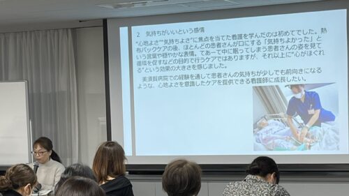 自らも2015年の‟愛媛て・あーて塾”に参加され、熱布バックケア、ノーリフティングケア、爪マッサージや爪切りなどを、日々の看護に導入されました。